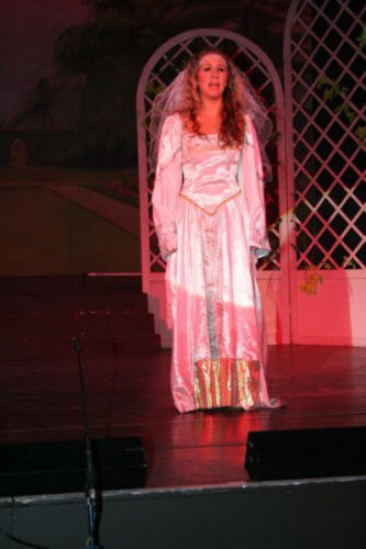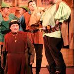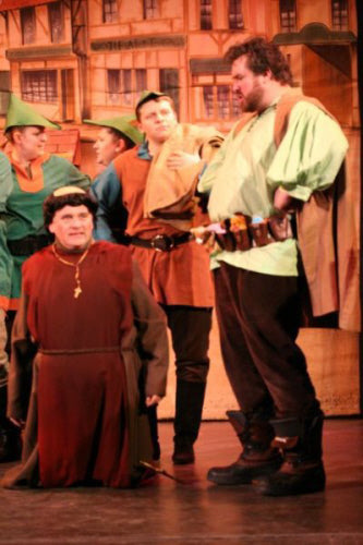 The Merry Men try to work out how to save Robin, so they send Bill(inda) off to find King Richard. Marian goes to see Robin in the dungeons and tells him that if she agrees to marry the Sheriff then he (Robin) will be released. Robin says that he’d rather die than see that happen. They sing a romantic song, and she exits in tears. The wedding is however announced and Bullseye and Nurse Nora undertake a bit of kitchen slapstick making a wedding cake before Nora goes to the Merry Men to ask them for help. The Men come up with a secret plan and head off to start working on it, leaving Nora, Friar Tuck and Little John to do the ghost gag. Bill(inda) arrives with King Richard, to find that everyone has left the forest.
