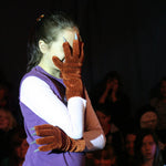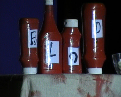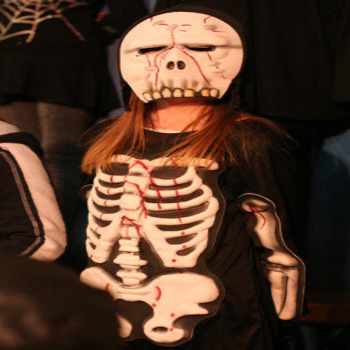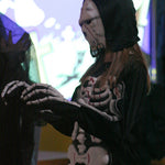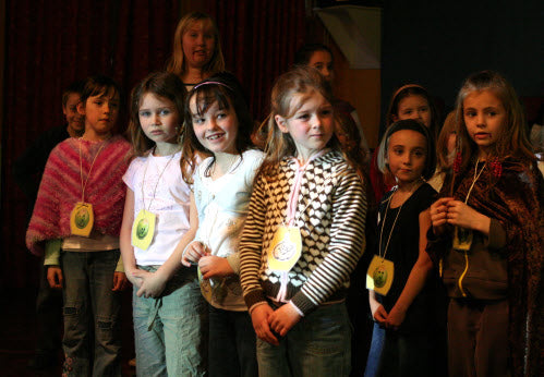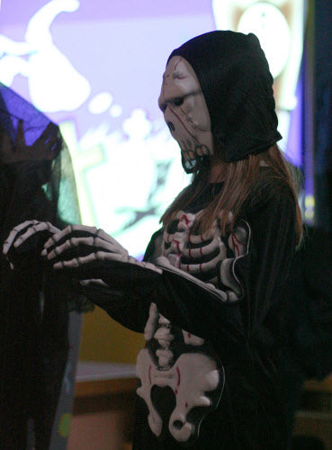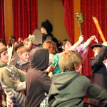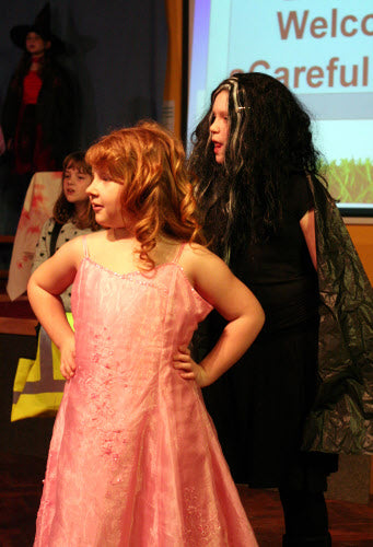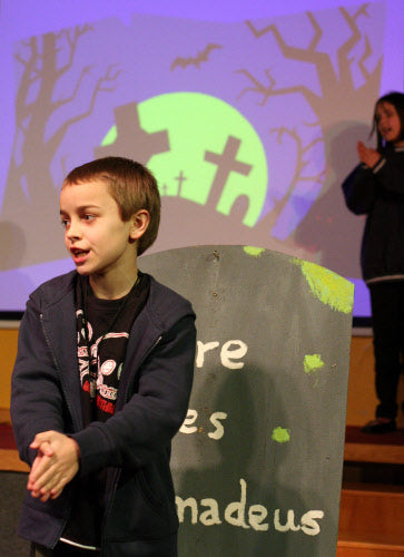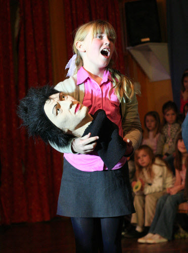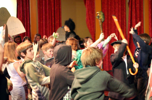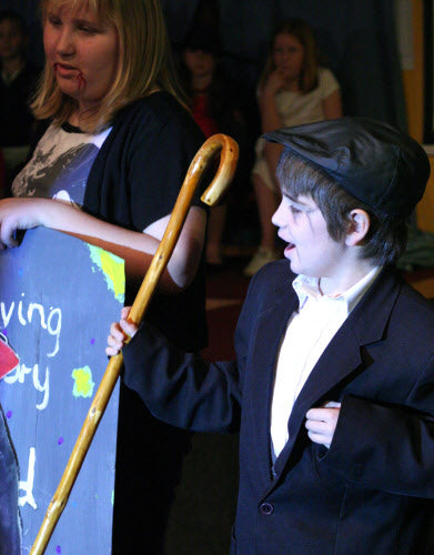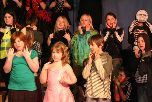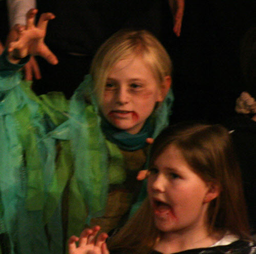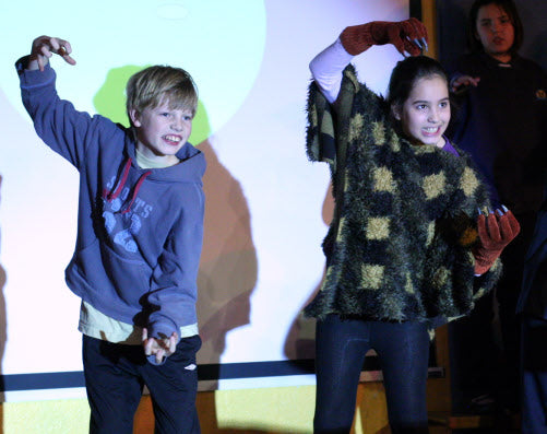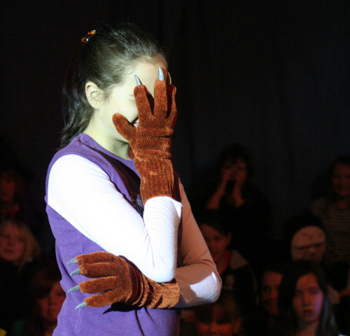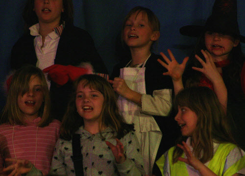 It’s midnight: on come the Fang Gang, Jonathan grandad, Mr Cheng etc. They appear to be carrying bodies, but they are in fact replica vampires (with papier mache heads). They lay these in front of the graves. Then they hide behind the gravestones and wait. The Sprouts and bullies appear to do battle. Triumphantly, they ‘slay’ the dummies. Unable to control his excitement, Fang Gang member Gory leaps up with a ‘Yee-hah!’ The Bullies and Sprouts realise they’ve been fooled. Grandad, Mr Cheng and the Fang Gang try to scare the Sprouts and Bullies, but fail. At the front of the stage, Jonathan appears, terrified. Scarlet appears as a wolf and reminds Jonathan that he has just said he ‘believes in the moon’. Jonathan realises that his ‘grown-up fangs’ have appeared. He turns and with Scarlet scares the opposition.